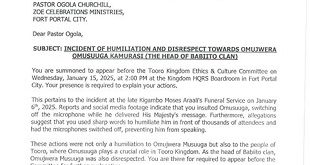 Hoima, Uganda | THE INDEPENDENT | Tooro Kingdom has summoned pastor Ogola Churchill of Zoe Celebrations Ministries, Fort Portal, accusing him of humiliating and disrespect towards the head of Babiito Royal Clan. According to a letter dated 10th January and signed off by the Tooro Kingdom Prime Minister, Stephen Kiyingi, the …
