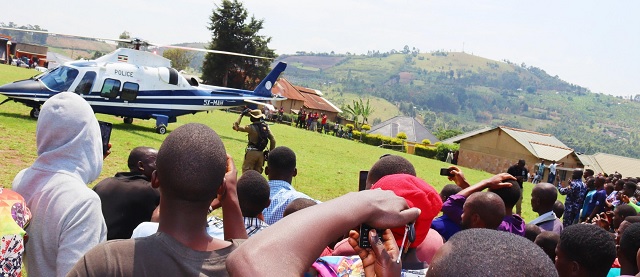 Children, youth and adult men and women alike, who thronged Rwashamaire town council soccer pitch about 300 metres from the venue gave a hard time to the Field Force Unit-FFU and Counter Terrorism police personnel who struggled to keep the excited crowd away from the chopper.