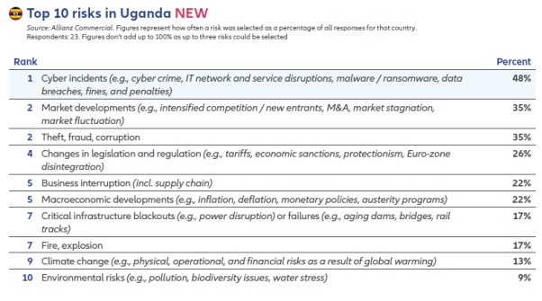 Cyber-attacks which include incidents such as ransomware attacks, data breaches and IT disruptions are also the biggest worry for companies around the world but, in Uganda, the threat ranks higher than theft, fraud, corruption, natural disasters and fire, noted the Allianz Risk Barometer.
