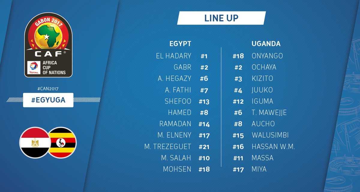 Starting line-up: D Onyango (GK), D.Iguma, G.Walusimbi, H. Wasswa, M. Juuko, K. Aucho, G. Kizito , T, Mawejje, F Miya, G.Massa (Capt), J. Ochaya.