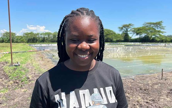 Women fish farmers pausing with a dummy cheque given to them by Rio Fish limited for some of the fish they harvested. BELOW – Aquarech ‘aquaculturalist’ Linah Velma pausing before the nursery ponds producing millions of fingerlings on the outskirts of Kisumu town.