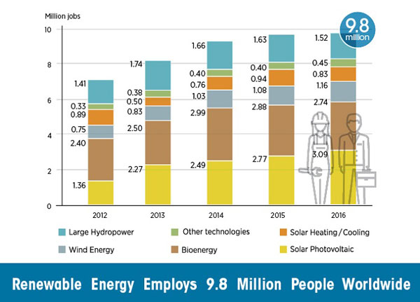 If large hydropower projects are included, the total number of global renewable-energy jobs climbs to 9.8 million.