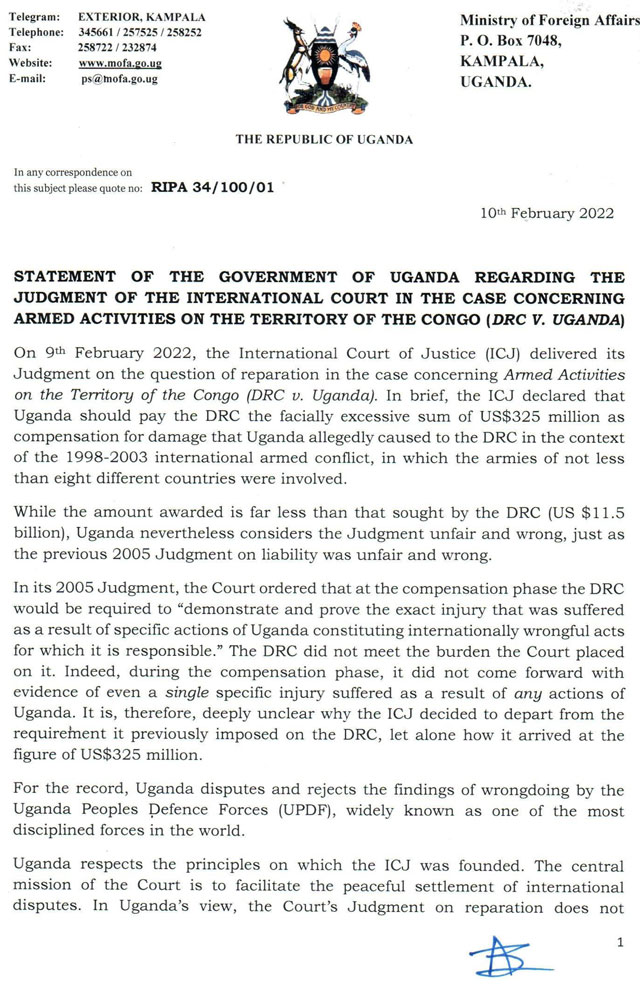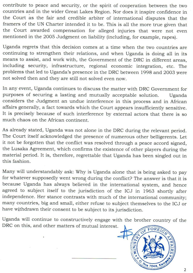 “In Uganda’s view, the court’s judgment on reparation does not contribute to peace and security, or the spirit of cooperation between the two countries and in the wider Great Lakes Region. Nor does it inspire confidence in the court as the fair and credible arbiter of international disputes that the framers of the UN Charter intended it to be,” reads the statement in part.