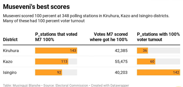 Unlike in Kiruhura and Kazo where Museveni scored 100 percent at all polling stations with 100 percent voter turnout, in Isingiro, polling stations with 100 percent voter turnout were more than those where Museveni scored 100 percent.