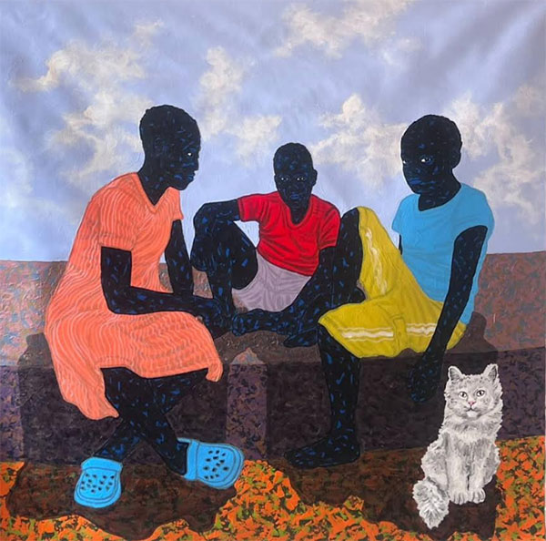 Growing up on the streets of Kampala and later in an orphanage was ironically a big motivation to his affirmation of his black identity and the need to preserve it amidst wide raging difficulties. The artist’s dark portraits of children grouped together or playing chess are a figurative representation to the idea of living communally which is a tenet of many African communities. Within orphanages, children are taught to live together as a family in spite their different backgrounds, and this instills in them virtues of love, compassion and resilience which contribute to self- discovery. Conversely, this experience conspires to the artist’s technique of creating a backdrop of often impasto like hues which can be interpreted as a figurative allusion to his interaction with a multiplicity of life experiences while living on the streets and in the orphanage. “My life is layered with many personal experiences I got from living on the streets of Kampala and in an orphanage. This has had a lasting impact on how I perceive life and everything which surrounds me,” he says in reference to the inspiration behind the impasto technique. It may also suffice to say that the deep blue-black expressive figurative portraits are a metaphor of hope and resilience within the context of the artist’s personal experience living in the orphanage.