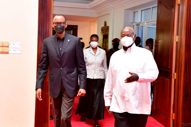 Rwanda’s President Paul Kagame (left) and President Yoweri Museveni at State House today. PHOTOS VIA PPU & @lindahNabusayi