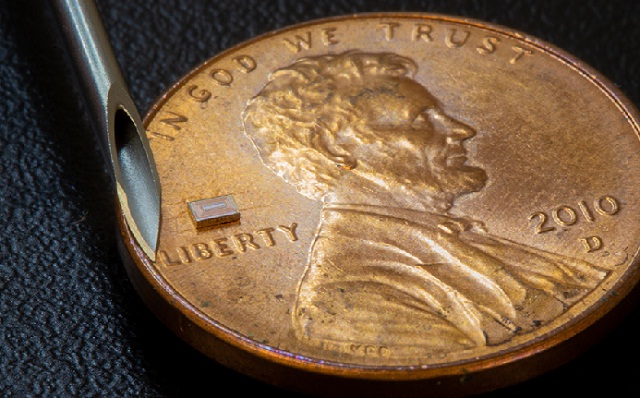 Alcohol monitoring chip is small enough to be implanted just under the surface of the skin. Photos by David Baillot/UC San Diego Jacobs School of Engineering