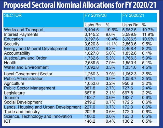 In the agriculture sector, the government plans to reduce the budget from Shs1trillion in FY2019/20 to Shs950.615bn in FY2020/21.