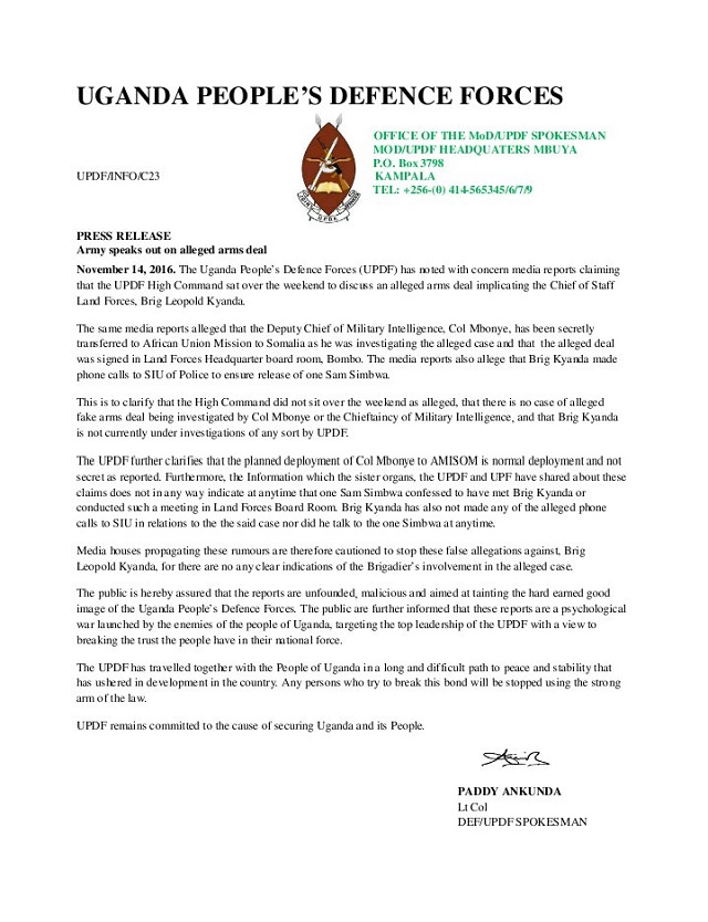 “The public is hereby assured that the reports are unfounded, malicious and aimed at tainting the hard earned good image of the Uganda People’s Defence Forces,” spokesman Paddy Ankunda said in a statement.