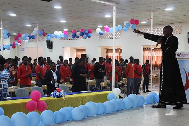 Rev Simon Musinguzi from All Saints Lweza prays for S4 candidates of Light Academy Secondary School in Kigo, Kampala on Saturday. The school had prayers for all faiths BELOW, a parent, Ms Barbara Babwetera, gives an inspiration talk to the candidates, before cake and photo opportunities at the different prayer spots.