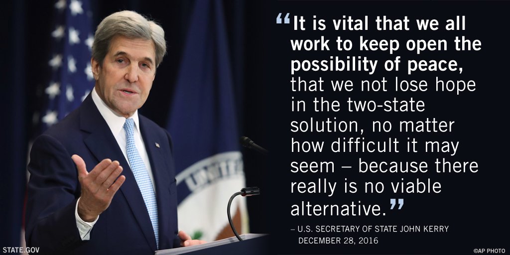 “The two-state solution is the only way to achieve a just and lasting peace between Israelis and Palestinians,” Kerry said, warning that such a solution is now in “serious jeopardy.”