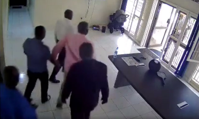 However, video footage from the security camera at Kabuleta’s office show about six plain-clothed men entering his office building. Four of the men approached Kabuleta who was chatting away with two other men and exchanging pleasantries.